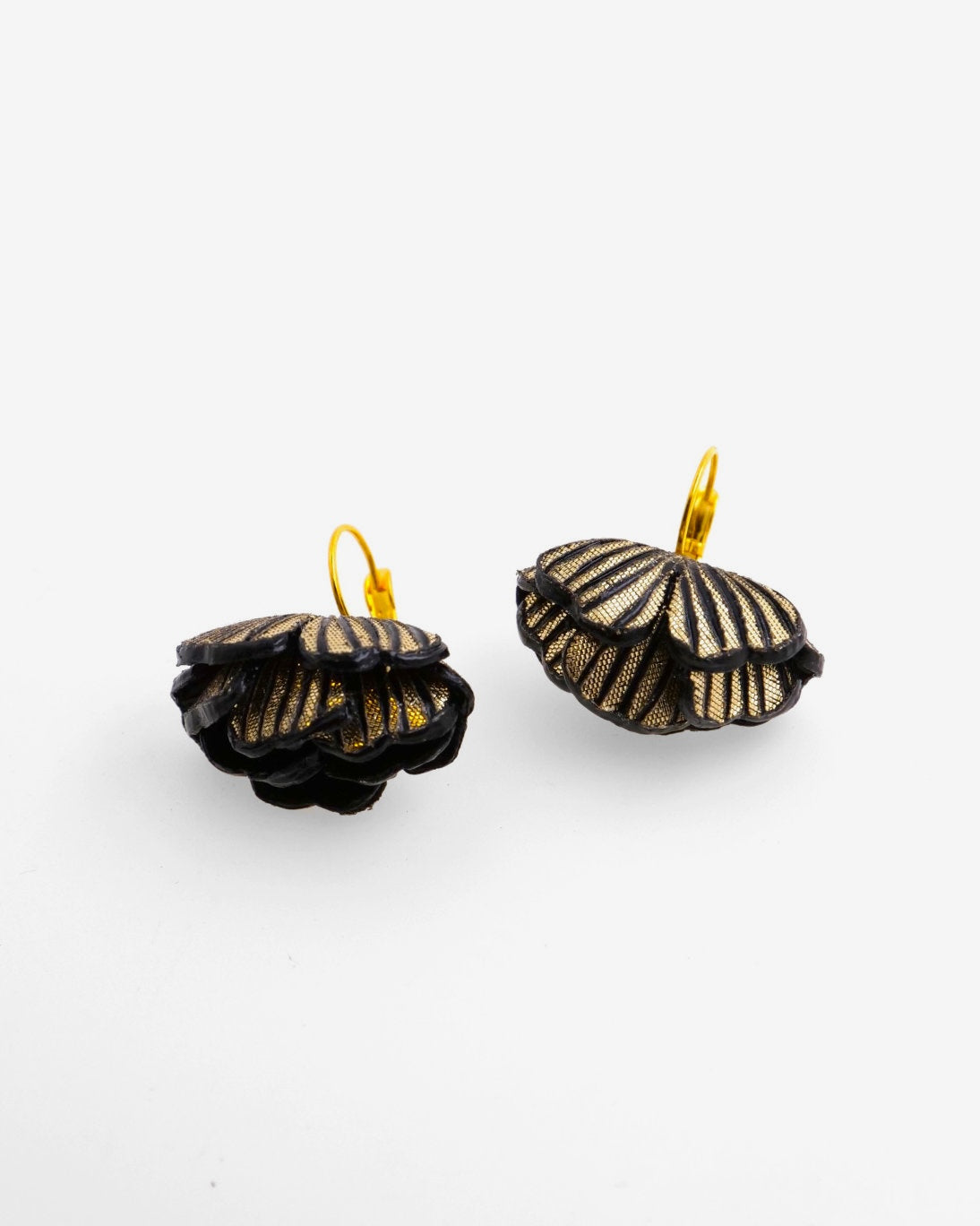 Chaque pièce naissait lentement sous ses doigts : le noir était choisi pour sa force silencieuse, son côté intemporel, tandis que le doré venait capturer un éclat secret, un souffle d’élégance qui ne se révèle qu’aux regards attentifs. Les boucles d’oreilles semblaient presque vivantes, portant en elles le contraste du jour et de la nuit, de l’ombre et de la lumière.