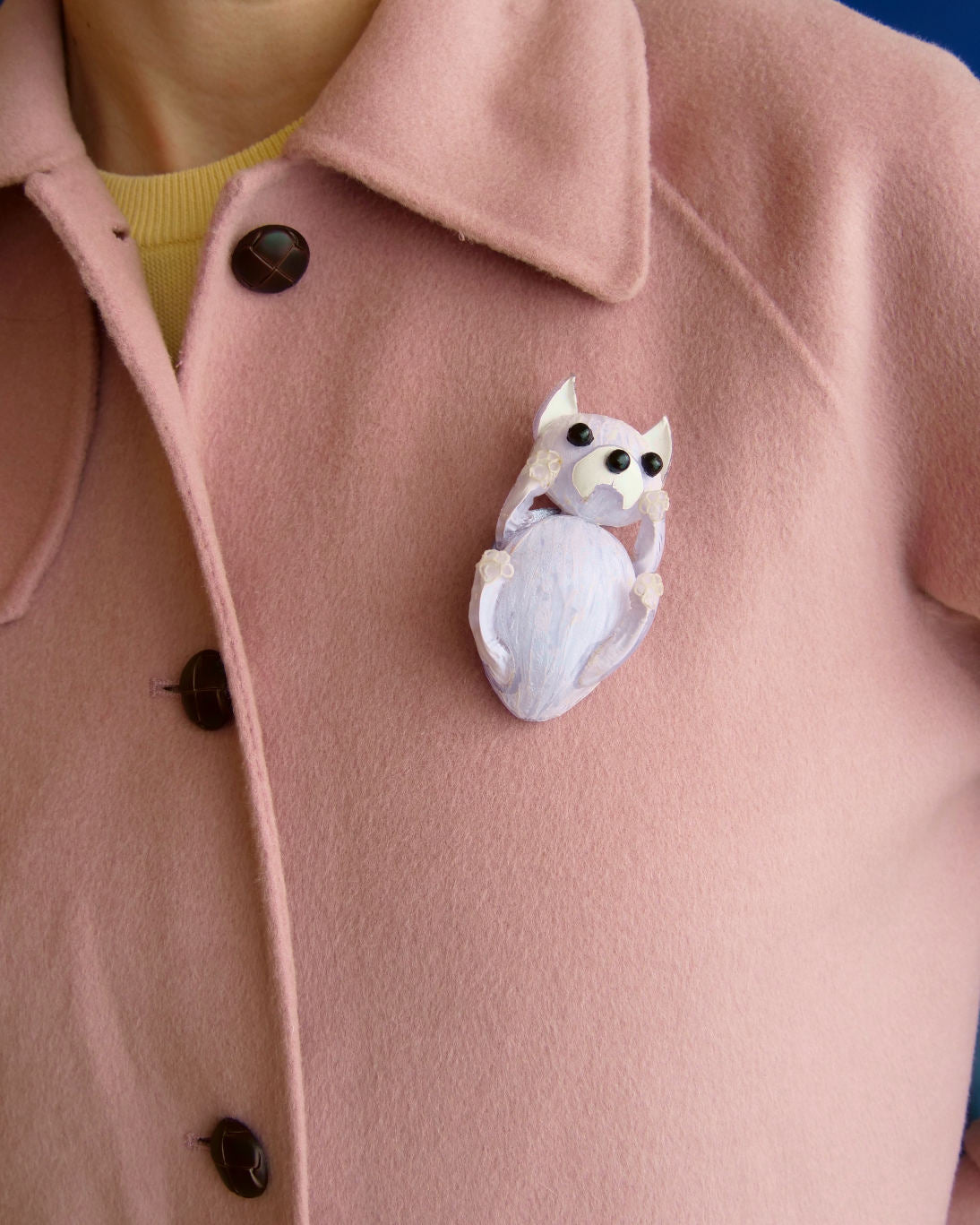 Her unique character and tender expression gave rise to an idea : to create a brooch in her likeness. A piece that would capture her joie de vivre, her loyalty, and her gentleness, and that could be worn as a small reminder of happiness every day.