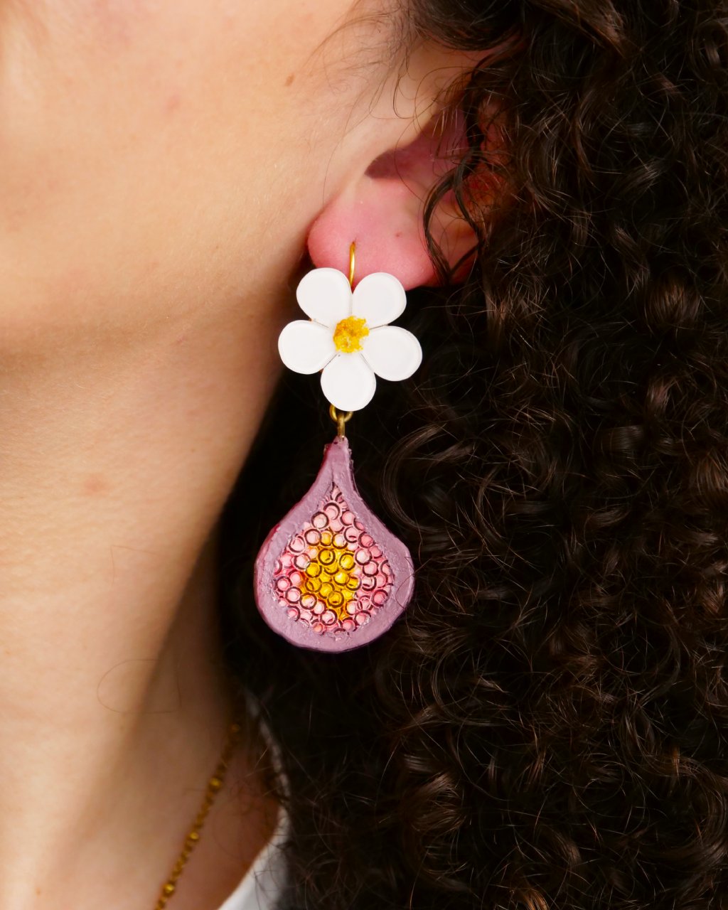 This piece of jewelry is crafted from Émaline, our signature resin, renowned for its high quality and its ability to make each piece unique. Thanks to the artisanal process, no two pairs are exactly alike. Particular attention has been paid to reproducing natural elements, especially the details of the fig's seeds, for a faithful and delicate rendering. Each Fig drop earring thus becomes a singular piece, both precious and poetic, inspired by the fruit and crafted with passion.