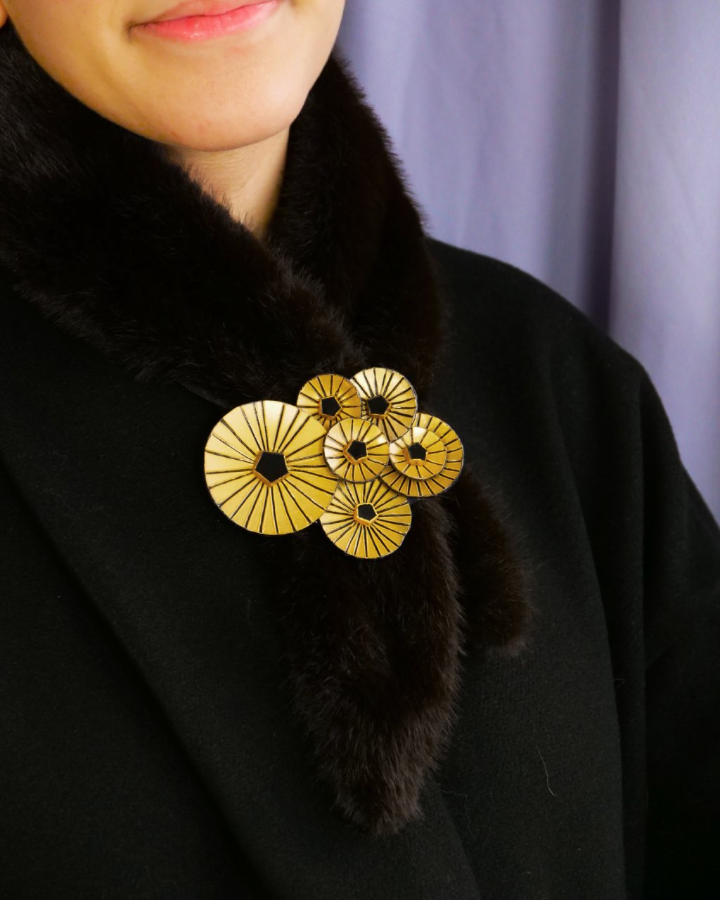 The Kyoto jewel brooch, composed of seven golden circles, black lines and hexagonal hearts, is inspired by the harmony and ancestral wisdom of Kyoto, an emblematic city of Japan rich in traditions, spirituality and aesthetics.