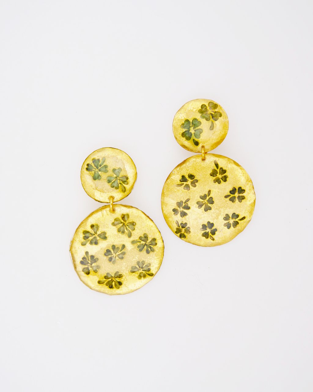Realizzati in Émaline, la nostra esclusiva resina, questi orecchini combinano leggerezza, resistenza e luminosità. Questi gioielli a forma di trifoglio sono tinti a mano con le nostre tinture artigianali, creando tonalità uniche, perlate o dorate, che catturano delicatamente la luce. Così, questi gioielli autentici diventano una celebrazione unica della natura e dei suoi tesori.